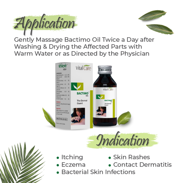 Application : Gently massage Bactimo Oil twice a day after washing & drying the affected parts with warm water or as directed by the physician.
